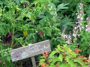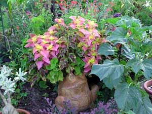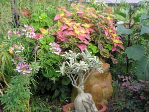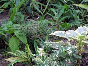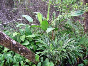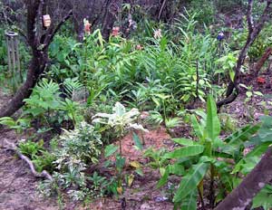 There I planted cannas, gingers (hedychium, kaempferia, costus, globba, zingiber, alpinia, curcuma and others) lots of colocasia and alocasia, musa, and brugmansia in the moist, rich ground and left my different cultivars of heliconia in their pots, as they will need to be brought in for the winter. | ![]() |
