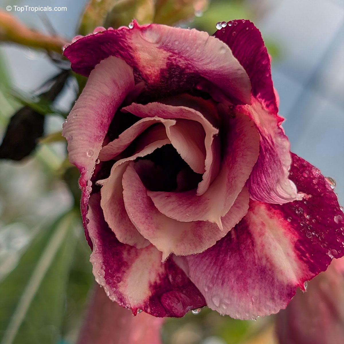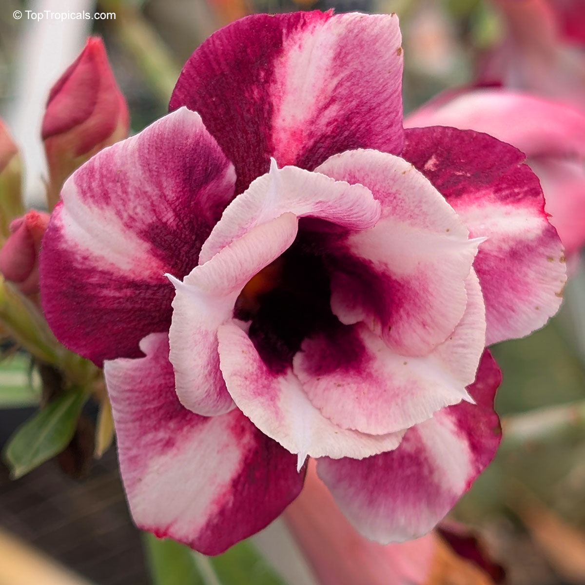 Adenium 'Purple Ruby', also known as Adenium 'Strawberry Sundae', features dramatic double blooms with deep burgundy outer petals and soft pink inner whorls.
