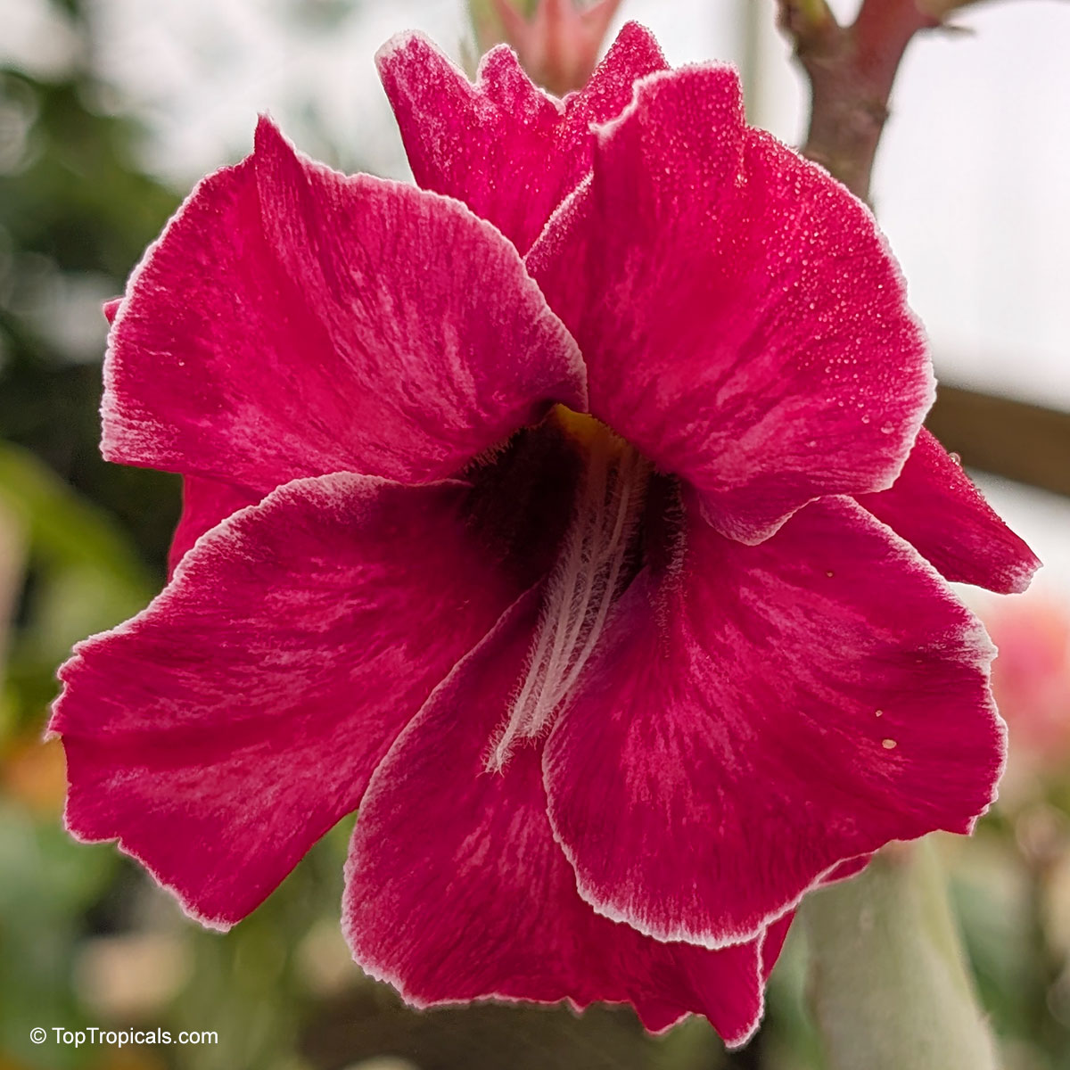 Adenium 'Beautiful Smile' - vivid crimson petals edged in white, opening in a joyful burst of color true to its name.