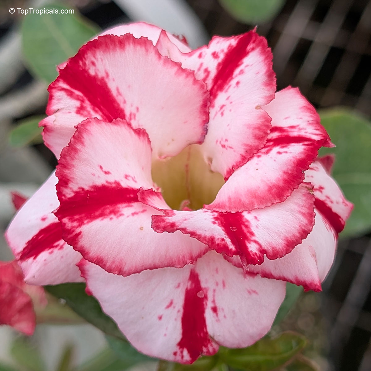 Adenium 'Big Harry' is a cultivated adenium hybrid distinguished by its bold, high-contrast flower pattern. Flowers are medium to large, usually single to semi-double, opening with a soft white to very pale pink base. Broad, saturated red bands radiate from the throat along the midribs and extend toward the petal margins, often merging with a red edging that frames each lobe. The pattern remains strong and clearly defined as the bloom matures, creating a crisp two-tone appearance.
