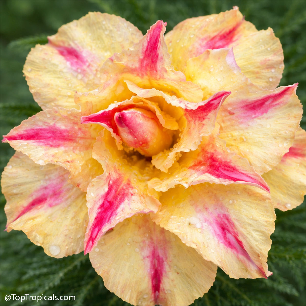 Adenium (Desert Rose) 'Golden Millionaire' stands out with its ruffled double blooms in soft yellow, boldly streaked with deep pink, creating a vivid and luxurious contrast.