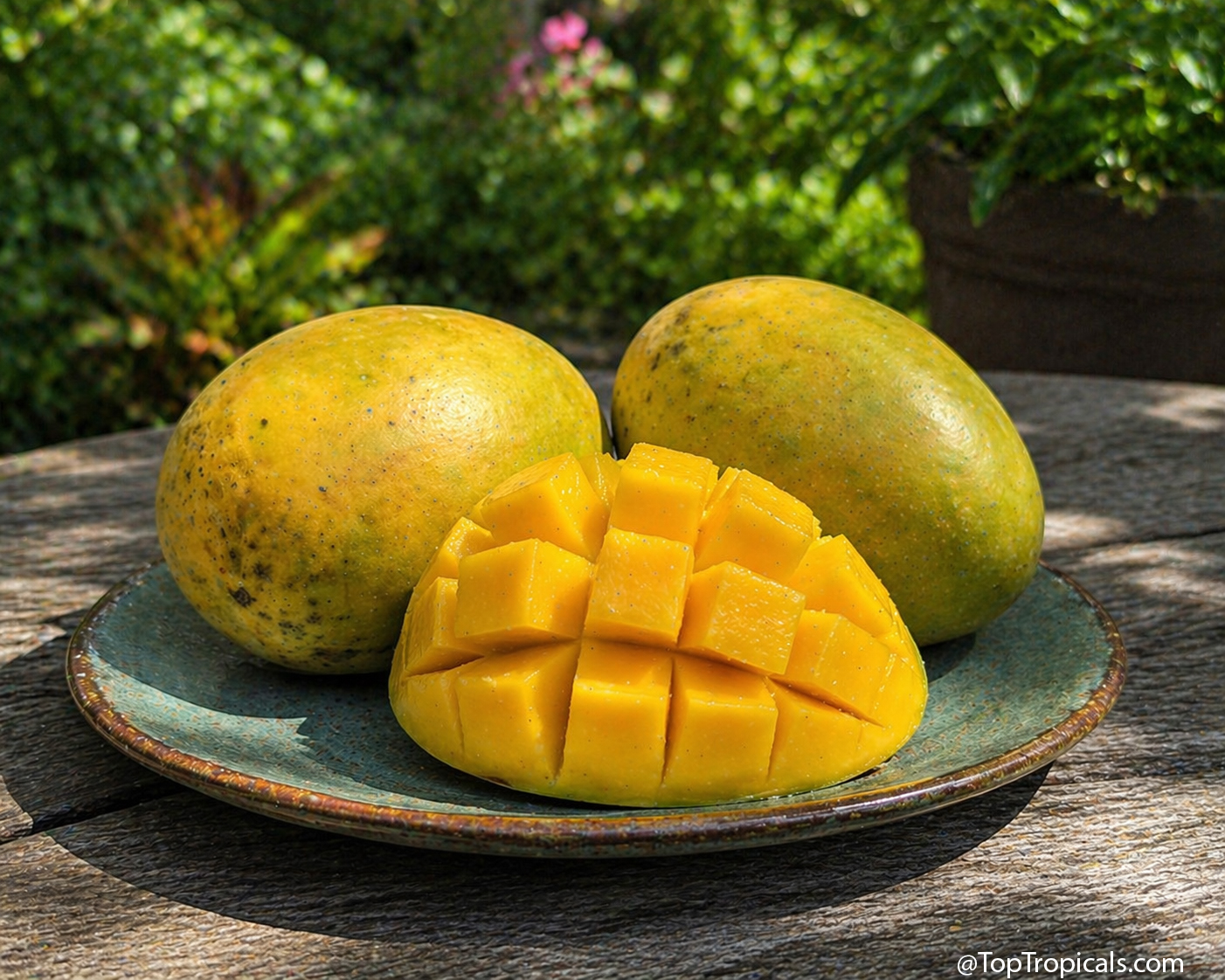 The fruit is medium-sized, smooth, and oval, weighing about 10-16 ounces. When ripe, the skin remains mostly yellow with only a faint blush, often showing a subtle yellow tone at the base that signals picking time. The flesh is deep orange, completely fiber-free, sweet, and aromatic, offering an exceptional tropical flavor with spicy undertones. Because the fruit bruises easily if it falls, it should be hand-picked rather than allowed to drop. Carrie ripens early to mid-season in Florida, typically from June to July. It thrives in USDA Zones 10-11 and tolerates short temperature drops to around 30F. Despite its modest coloration, Carrie is celebrated for its unmatched flavor and dependable performance in home gardens.