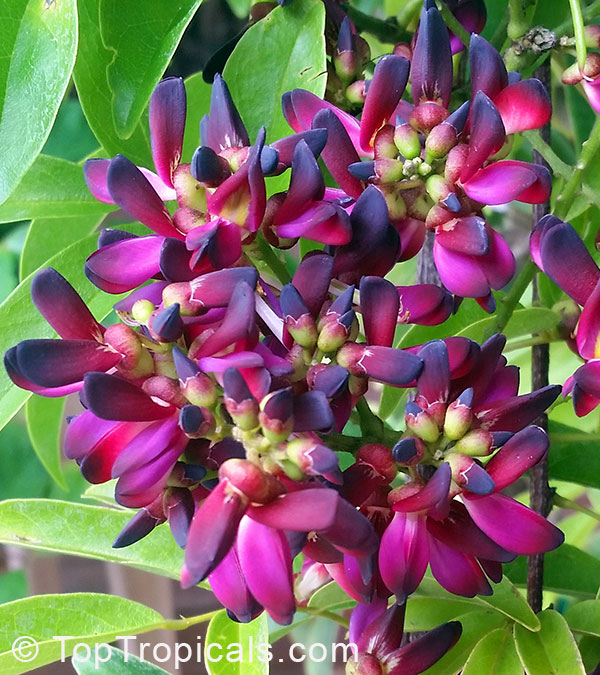 Millettia reticulata or Evergreen wisteria produces a profusion of fragrant blue, lavender or purple flowers that attract butterflies and hummingbirds. Its foliage is a glossy emerald green, and in colder months, a warm reddish-brown hue. The plant is cold hardy at least to mid-20s F for a short time, so it can be grown in USDA Zones 8-10. For colder regions, plant evergreen wisteria in containers and move it indoors in winter. As evergreen wisteria grows, prune it regularly, at least twice a year, to keep its size and shape in check.