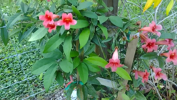 Fast-growing cross-vine with deep red buds in spring, which open to reveal a cheery yellow inside. Tubular flowers appear in late spring. Very cold hardy, easy to grow.