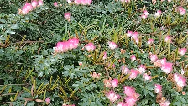 Calliandra angustifolia, also known as Bobinsana or Pink Powderpuff, attracts bees and other pollinators with its delicate, brush-like blossoms