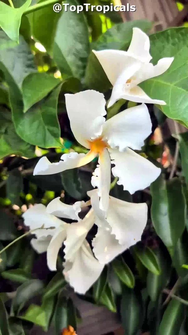 Chonemorpha fragrans (Frangipani vine) blooms almost year-round at Top Tropicals Garden, with nonstop fragrant flowers from spring through winter.