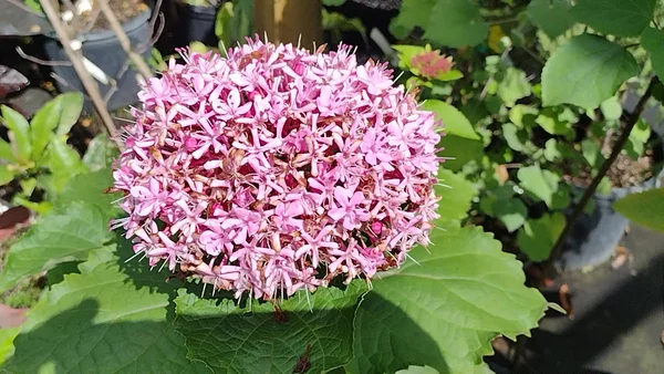Clerodendrum bungei (Rose Glory Bower) is a suckering shrub with large heart-shaped leaves and clusters of fragrant pink flowers attractive to butterflies.