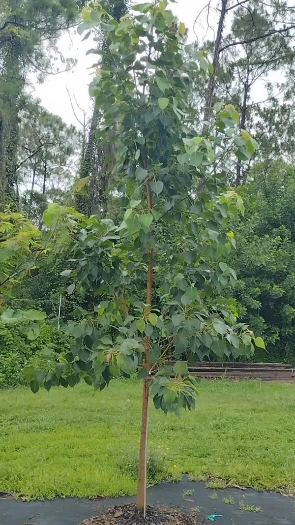 Bo-Tree, Sacred Ficus. This large deciduous tree is sacred to the Hindus and Buddhists, under which Budda received enlightenment. This fast growing tree usually begins as an epiphytem (air plant, grows on trees) but develops roots to support its height of ninety plus feet. The Bo-Tree has purple figs and is different from other species, because of its slender, long leaf tip. Can be grown as bonsai.