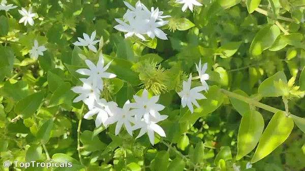 Angel Hair Jasmine. Bushy dense vining shrub with star-like white fragrant flowers and soft velvet leaves. Very fast growing, great for hedges.