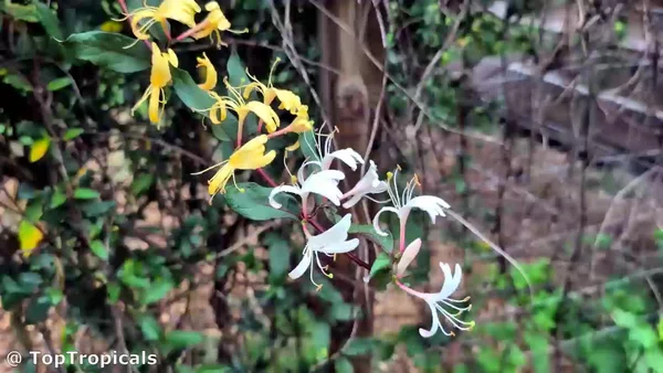 Lonicera japonica (Japanese Honeysuckle, Halls Honeysuckle) is a fast-growing vine with fragrant white and yellow flowers, ideal for covering fences, trellises, and arbors.