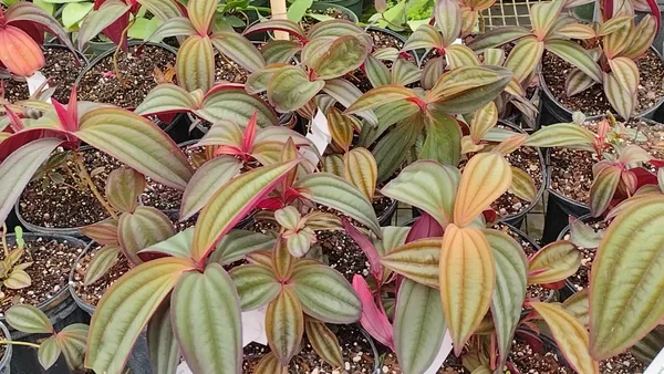 Its broad, deeply veined leaves with purple to reddish undersides protect the column of flowers clustered along the stems.
