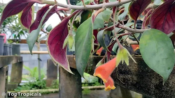 Nematanthus Bijou is a cross between N. wettsteinii x N. fritschii. The variety Bijou has extremely ornamental leaves with bright mauve underneath. Nice large pendent flowers much like N. crassifolius and N. corticola. Plants are easy to care for, drought resistant, and, with proper care, can bloom all year. The variety Bijou has extremely ornamental leaves with bright mauve underneath. Plants are easy to care for, drought-resistant, and, with proper care, can bloom all year. Tolerates filtered light, perfect houseplant!