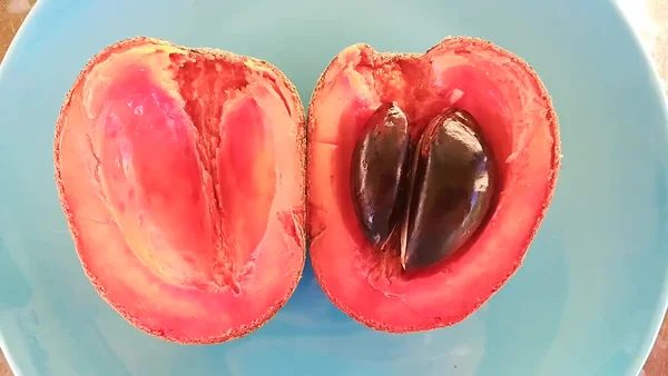 The fruit has delicious bright orange soft flesh, sweet and pumpkin-like in flavor. The Mamey fruit is eaten fresh, in milk shakes and ice cream.