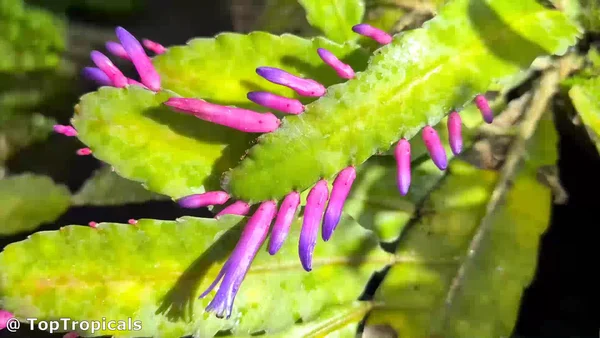 Spectacular bloomer! With foliage resembling an Orchid Cactus (Epiphyllum), Blue Flame is a rare epiphyte from the rainforests of the Amazon jungle. This is a spineless tropical cactus that blooms bright purple flowers. Flowers emerge along the leaf edges from late spring through early summer, and blooms for a couple of weeks. Early springtime flowers are magenta, but summer flowers have the distinctive blue tip on the magenta flower. Mature leaves are about 12" long. Blue Flame prefers a hot, humid environment similar to its jungle habitat. Grow in porous cactus soil or Adenium Mix in partial sun to bright, indirect light.