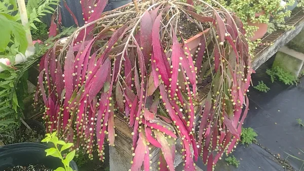 Red Rhipsalis. Arched then completely pendant flat tapeworm stems turn deep violet red in high light; tiny flowers followed by ornamental shell berries lining both edges of the ribbon stems most attractively.