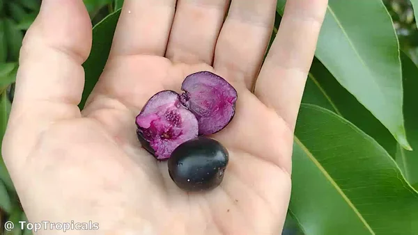 Jambolan, Java Plum - Jambolan has fragrant white flowers in branched clusters at stem tips and purplish-black oval edible berries. Jambolans of good size and quality, having a sweet or subacid flavor and a minimum of astringency, are eaten raw and may be made into tarts, sauces and jam. The jambolan has received recognition in folk medicine and in the pharmaceutical trade. The seeds, leaves and bark are also used in various alternative healing systems like Ayurveda and Chinese medicine. According to Hindu tradition, Rama subsisted on the fruit in the forest for 14 years during his exile from Ayodhya. Because of this, many Hindus regard Jambul as a "fruit of the gods". In Hindu mythology Lord Krishna has been described as having skin the color of Jambul. The leaves are used in India as marriage pendals.