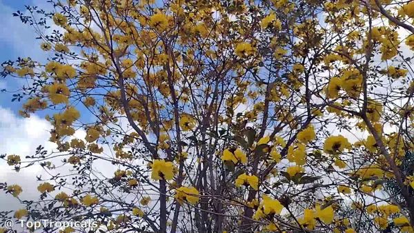 Dwarf Golden Tabebuia. A sparse crowned small to medium tree with large heads of golden yellow flowers. Good choice for a small garden or potting culture.