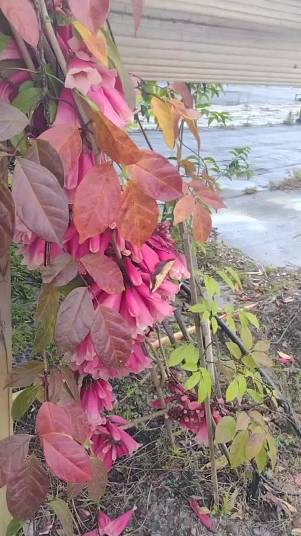 In late winter to early spring, it produces large clusters of trumpet-shaped flowers with deep pink tubes and creamy-white lobes, creating a striking contrast. This well-behaved climber is easily maintained at shorter lengths, making it suitable for trellises, arbors, or even large containers.