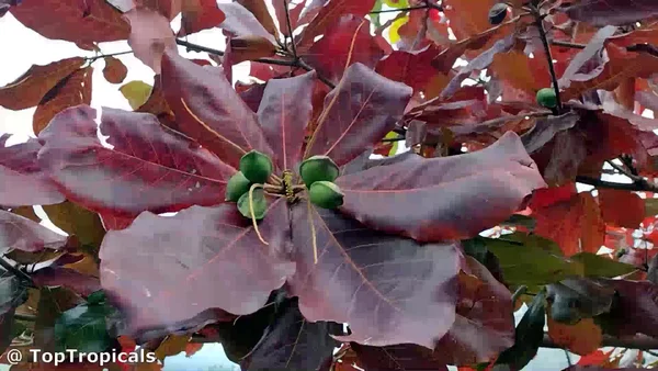 Terminalia catappa, commonly known as the Tropical Almond, stands out in the tropics with a rare burst of fall color, as its glossy leaves turn vivid red, orange, and mauve before dropping. At the same time, its almond-like fruits ripen, offering both beauty and edible nuts.