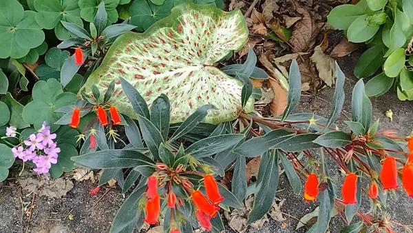 Caladium bicolor leaves show vivid pink and green patterns that make the foliage look painted.