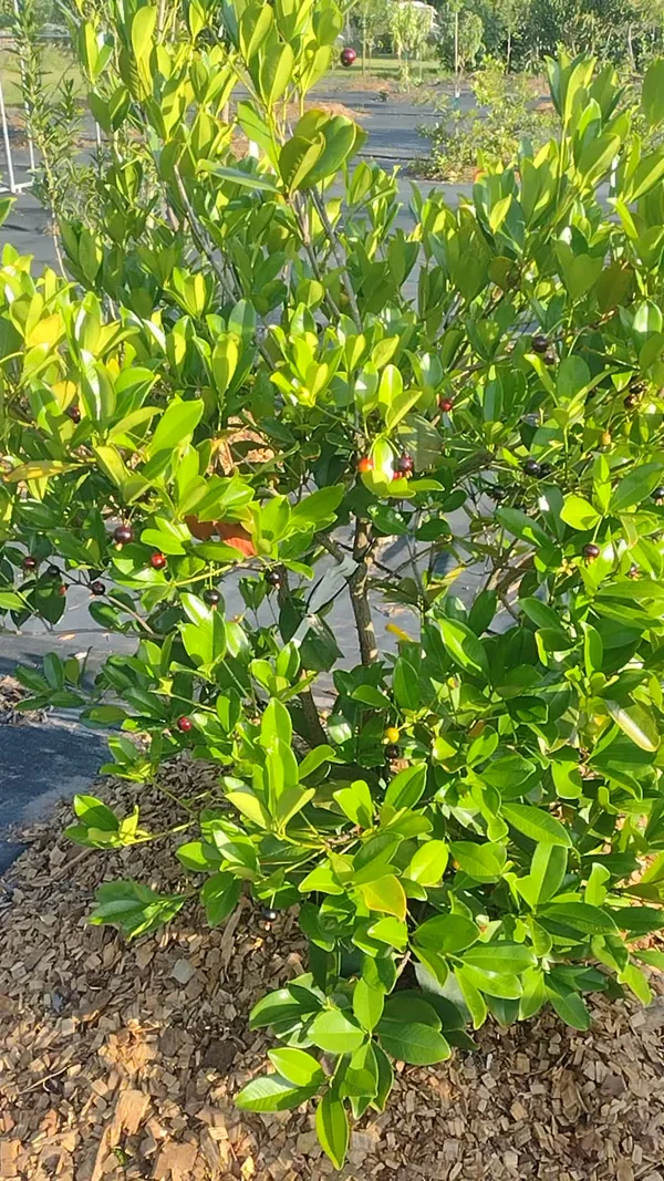 Grumichama, Brazilian Cherry. This compact tree has beautiful glossy green leaves up to 3-4 inches long and one to two inches wide, with leathery texture, and the new growth is a wine reddish color before it matures. Fruits follow quickly in about four weeks after flowering. They are about one inch or larger, purplish black in color with large seeds and excellent melting flesh that has almost the flavor of a northern cherry. Eaten fresh and used in jelly. The Grumichama makes an excellent container plant and will fruit quite nicely in a five to ten gallon-size container.