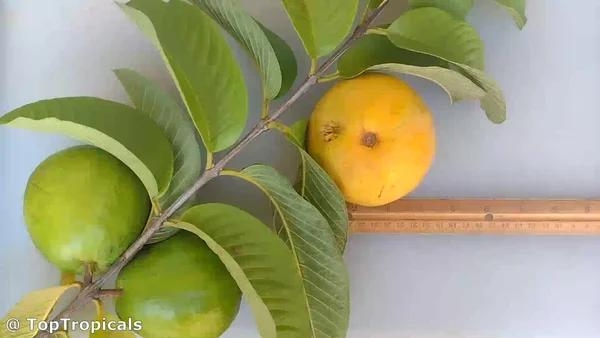 Taiwanese Guava. It is a large, crunchy guava containing few seeds. Guava is a good tropical fruit tree not fussy on the soil quality, and produces fruit year after year. It is relatively cold hardy. Requires regular watering. Great container plant, will fruit in a pot in small size.