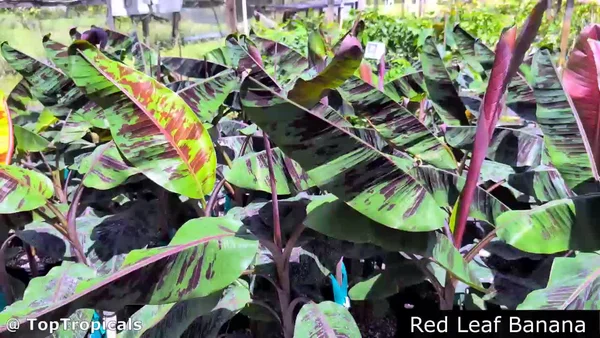 Banana Zebrina Rojo, Blood Leaf, Red Leaf. This outstanding banana features large, variegated leaves with red splashes on top, burgundy undersides, and reddish stems giving rise to the name Blood Leaf Banana. It shows up well against solid green companion plants, and performs well in containers. It will overwinter nicely in colder climates and produces small red fruit.