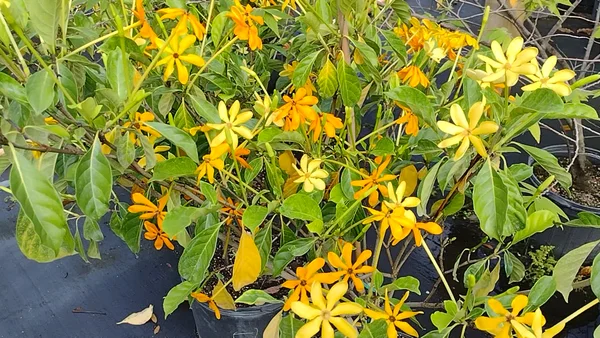 Golden Gardenia Kula - very rare tropical gardenia. Medium size slow growing shrub with leathery leaves and fragrant flowers that change color from ivory through yellow to orange.