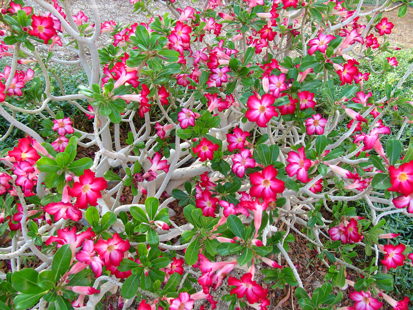 Exotic species of Adenium: Adenium swazicum, Adenium somalense, Adenium arabicum, Adenium boehmianum, Adenium multiflorum, Adenium crispum, Adenium obesum. Adeniums have many spectacular hybrids. The basic culture is very similar to orchids. A small pot with excellent drainage is a must. Adeniums do not like both over-watering or drying-out. There is a little secret of how to create a weird shape of the base: lift the plant a bit every time you re-pot the plant, so that the upper part of roots will be a little exposed. The plant will form more roots that will go down. To make your plant develop a large swollen base/trunk, you'll need a good quality fertilizer. Fetilizer requirement for swelling up trunks is also used to increase flowering. It shouldnt be too hight in nitrogen, the middle number should be the highest. Never apply fertilizer directly on roots and do not liquid feed when a plant is thirsty: always water first slightly to avoid root burn and leaf drop. Do not wet leaves. Adeniums need lots of light for heavy flowering. Most hybrids and species start blooming in the spring when the conditions are warm and days get longer, and continue blooming through the fall and winter in warmer climates. Adeniums like a neutral to hard water. Acidic water tends to sour the soil too fast and may cause root rot. Water plants preferably in the early morning, and allow them to drink up throughout the day. Watering can be done daily to every few days. Never allow your plants to sit in a saucer of water, but don't let them to dry out too often - this causes adeniums to go into early dormancy.