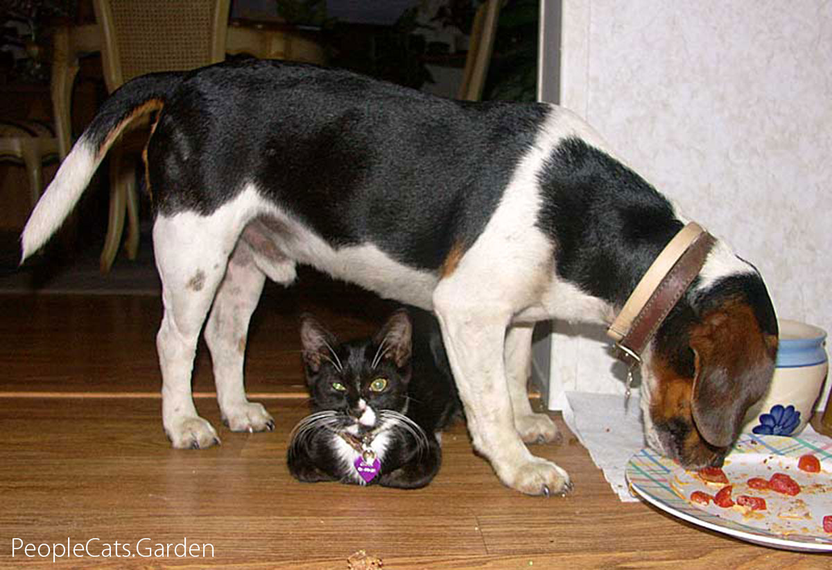 🐈📸 Cat ShortStuff is guarding his buddy Beagle Bobby finishing leftovers at TopTropicals PeopleCats.Garden