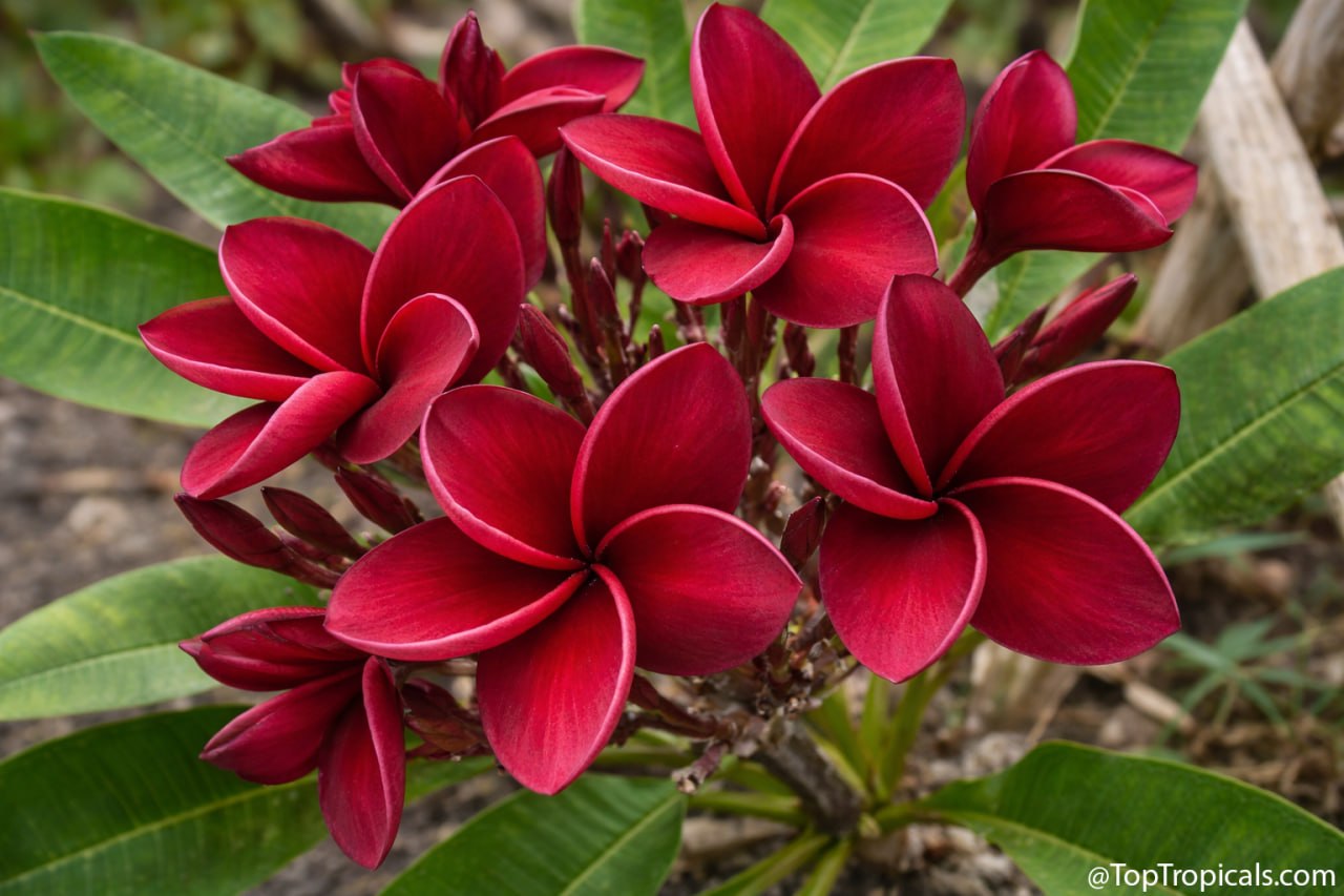 •  ✦ Plumeria Hwa Kor (Reddy Black) - deep velvety red flowers with rich, saturated color and thick, sculptural petals. Blooms form tight clusters at the tips, giving it a strong, bold presence.