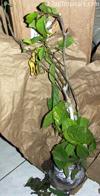 These two plants of Cananga on the photos travelled 9 days because of the wrong address provided. They look pretty much stressed out but still have good chances to survive under a proper care. Even some flowers didn't drop off.