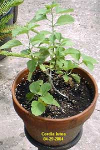 "You had asked for an update on that Cordia lutea that I had ordered several weeks ago. It seems to be recovering well and looks like a happy little tree. I have attached a picture of it in the small pot in which it was planted (so as not to overwhelm the root system). It will be planted in a larger pot very soon.